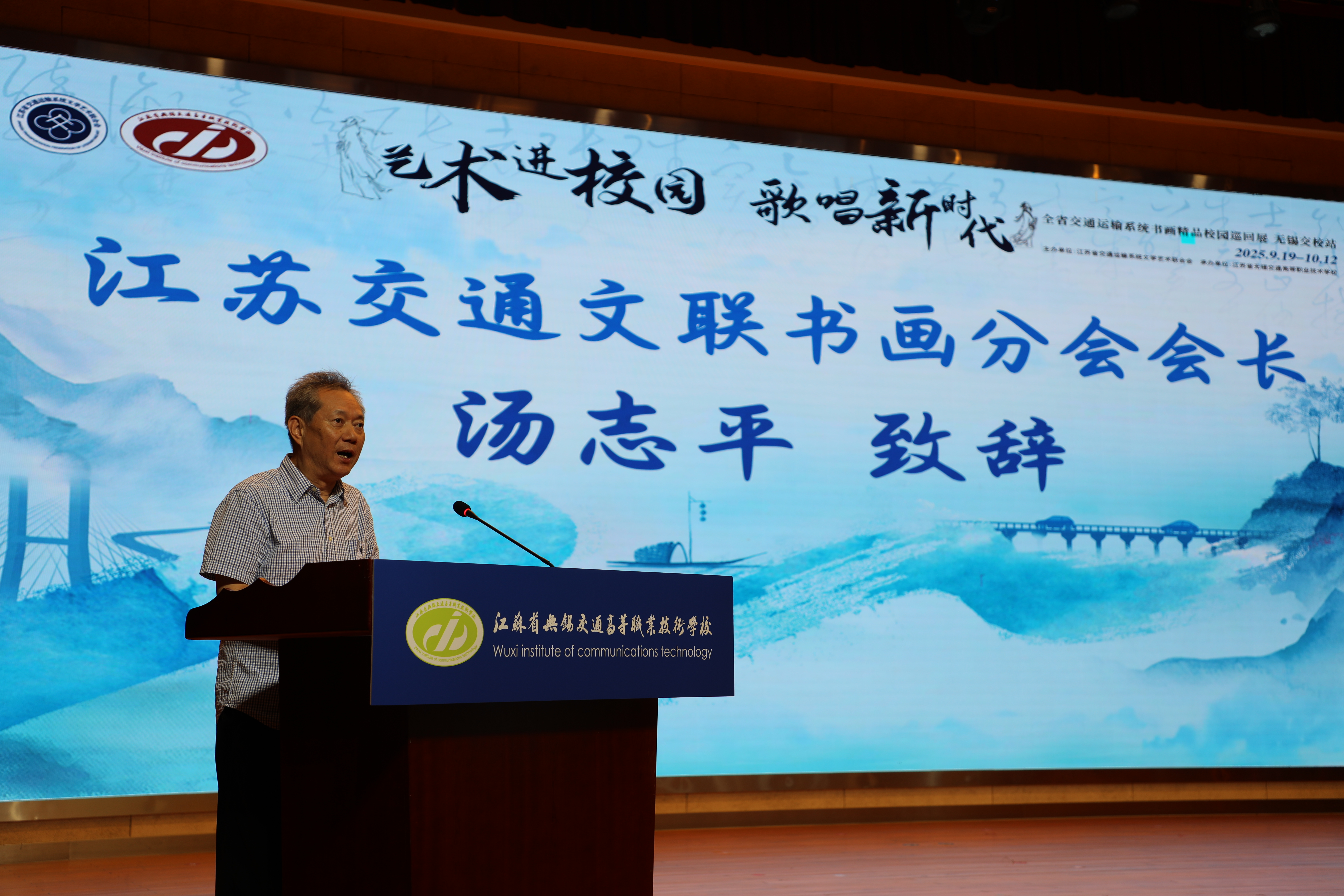 李进在致辞中对江苏交通文联长期以来的关心支持表示感谢,并简要介绍了学校在文化建设方面的成果。他表示,学校始终坚持以习近平新时代中国特色社会主义思想为指导,秉承“行知立身,师表立教”的校训,系统推进以文化人、以美育人的校园文化工程。学校将以此次书画展为契机,引导更多学生在交通强国的征程中锚定方向、在传统文化的滋养中汲取力量、在技能成才的实践中勇担使命,努力成长为具有深厚家国情怀、精湛技术技能、高雅审美情趣的新时代交通工匠。